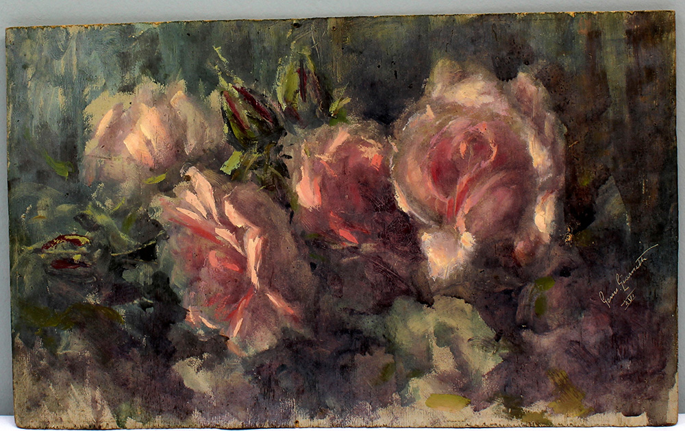 Firma indecifrata, "Rose" olio su compensato (cm 43,5x27) firmato e iscritto in basso a destra (lievi difetti)