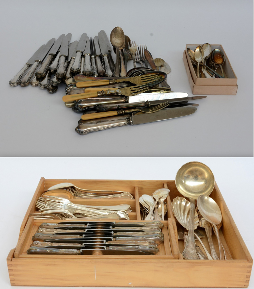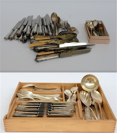 Lotto di due scatole contenenti numerose posate di differenti fatture (difetti)