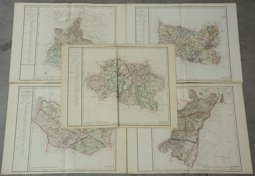 Lotto di cinque antiche carte geografiche tratte dal Atlas National de France e illustranti i dipartimenti della Francia (Ardenne, Bas Rhin, L’Oise, L’allier, La Somme), coloriture ad acquerello (difetti)