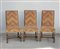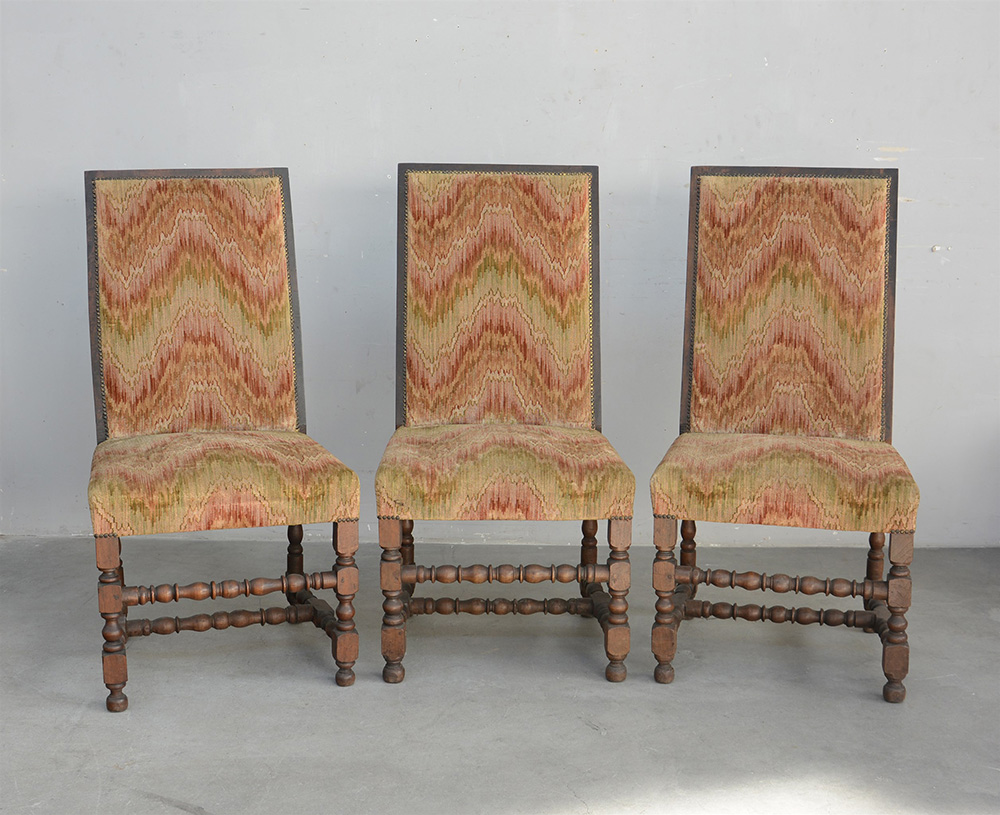 Gruppo di tre grandi sedie con gambe "a rocchetto" rivestite in tessuto a disegno ramato fiammato (difetti).
