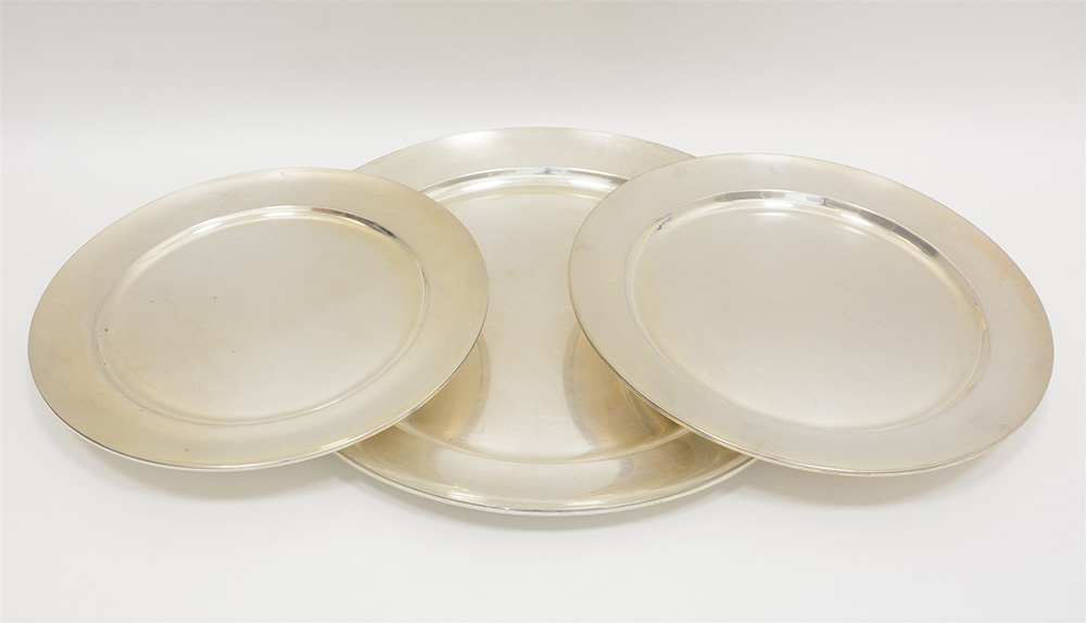 Tre vassoi in scala di forma circolare e superficie liscia. Italia secolo XX. Marcati spoggi (d. max 37,5) (g 2100 ca)