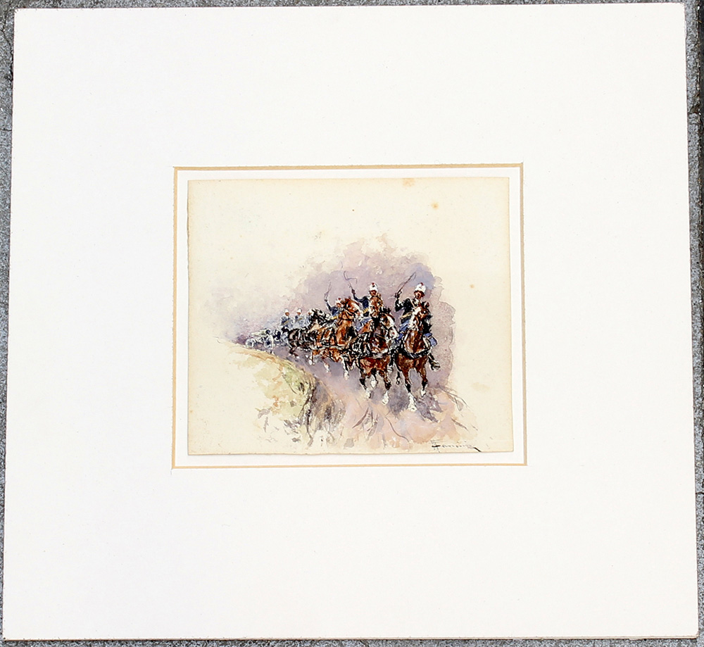 "Carica di cavalleria" tecnica mista su carta (mm 85x97) Firmato in basso a destra (lievi difetti)