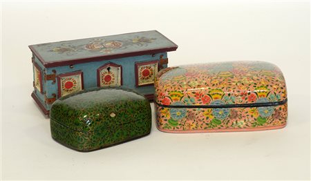 Tre scatole in legno e lacca una contenente bigiotteria e due orologi da...