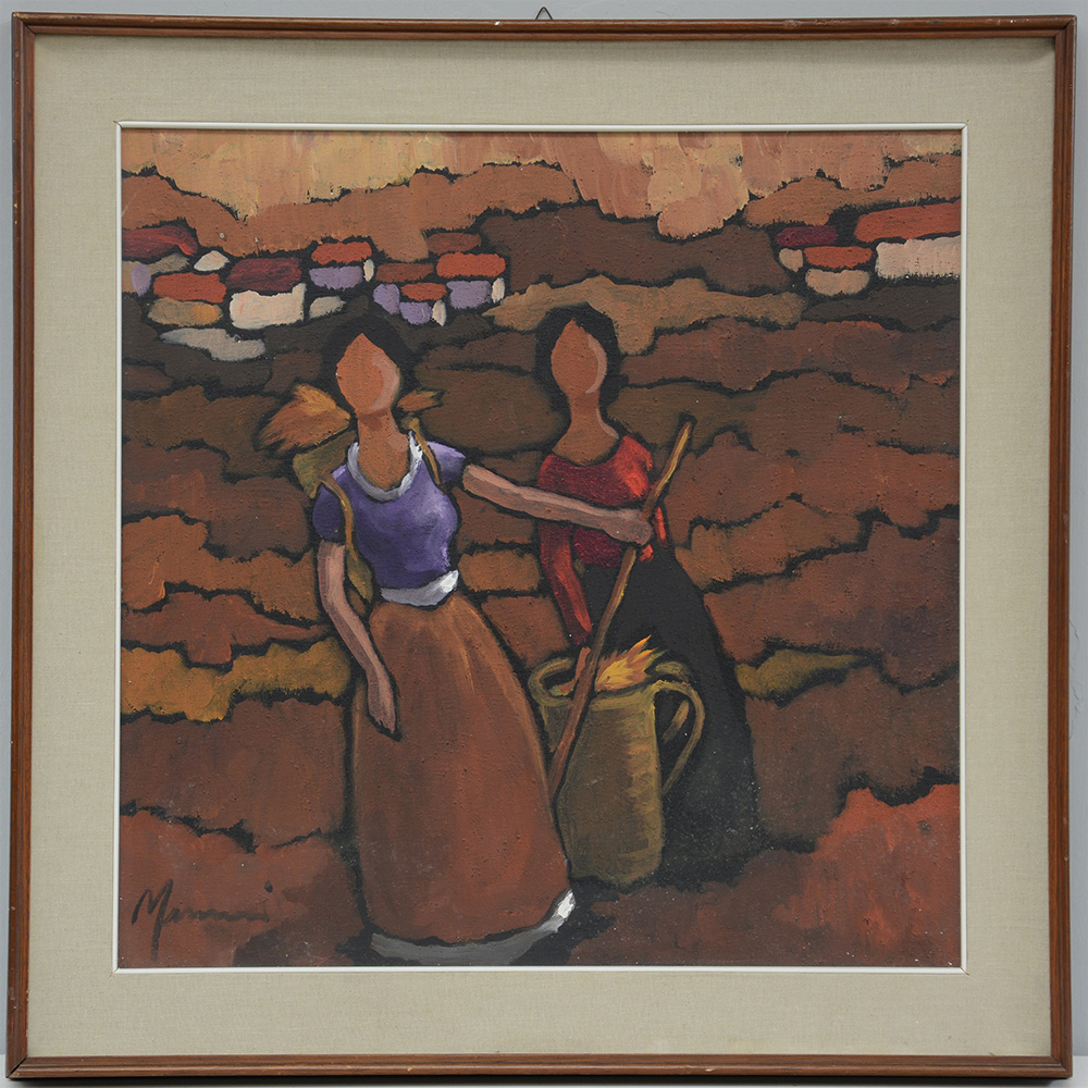 Firma indecifrata "Contadine nel campo" olio su tela (cm 60x60) firmato in basso a sinistra, in cornice