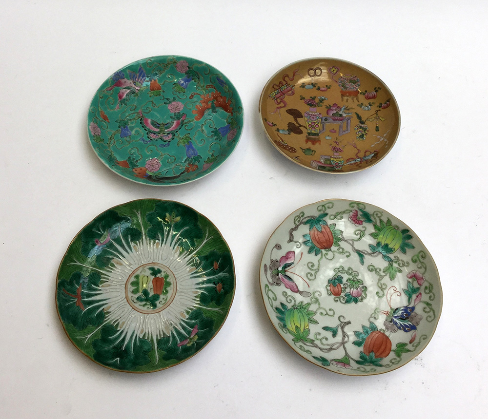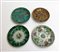 Quattro piatti in porcellana policroma con decori diversi (lievi difetti)(h...