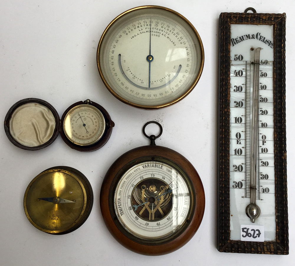 Lotto composto da una bussola, tre barometri olosterici ed un termometro da parete (difetti)