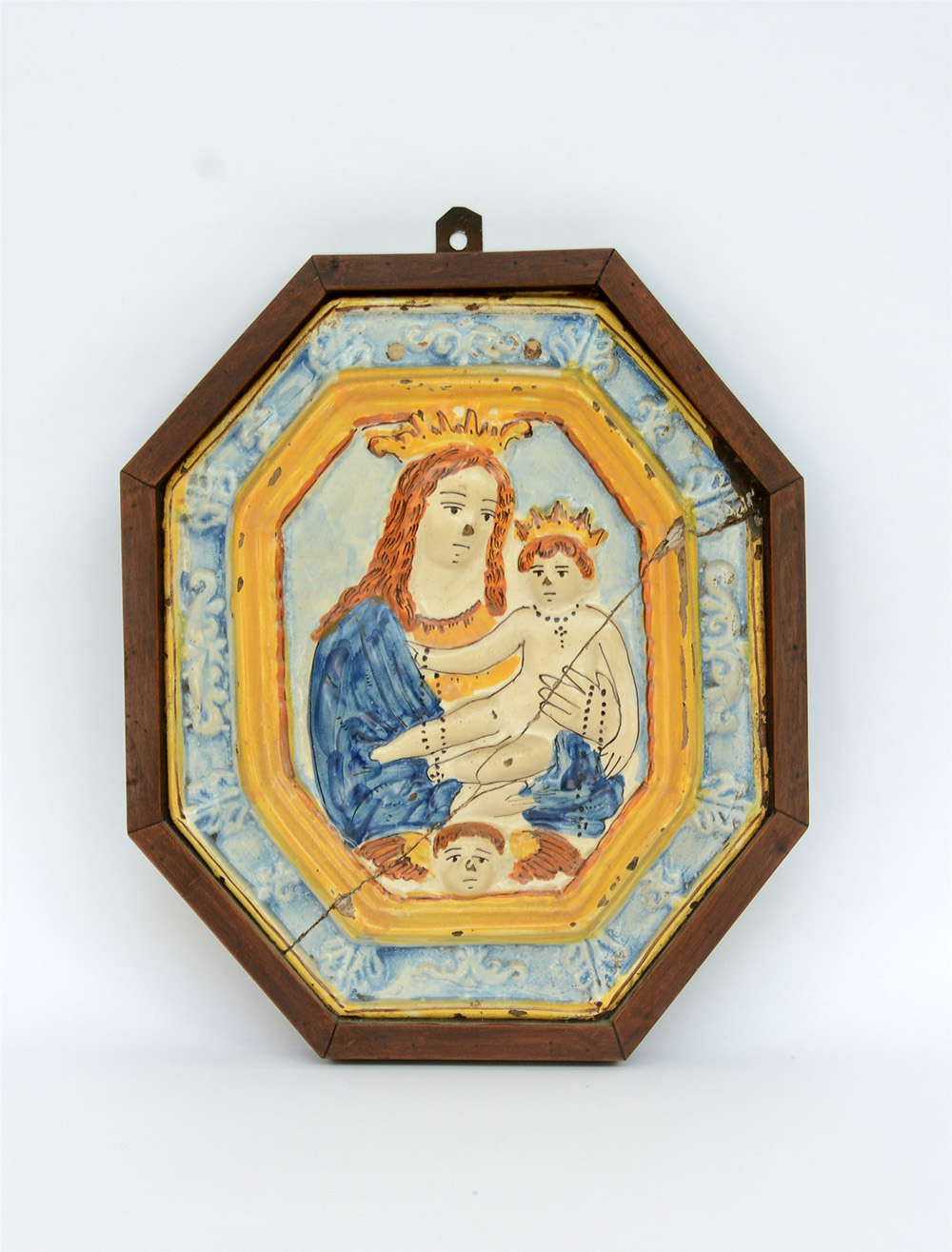 Targa ottogonale in maiolica policroma con Madonna con Bambino a rilievo (cm. 26,5x 32) in cornice. Italia meridionale, XIX secolo (difetti e restauri)