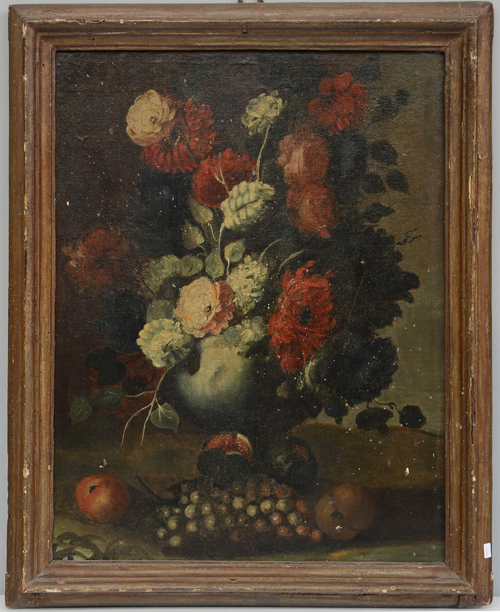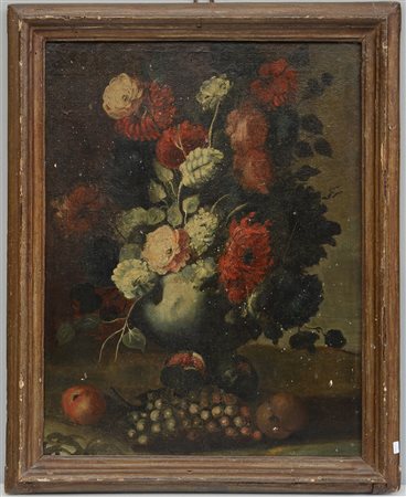 Scuola del secolo XVIII "Vaso con fiori e frutta" olio su tela (cm 58x44). In cornice (difetti e restauri)