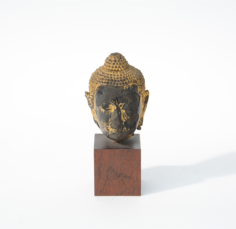 Testa di Buddha in bronzo dorato su base in legno. Manifattura dell'Asia Sud-orientale (difetti) (h. 12 cm.)