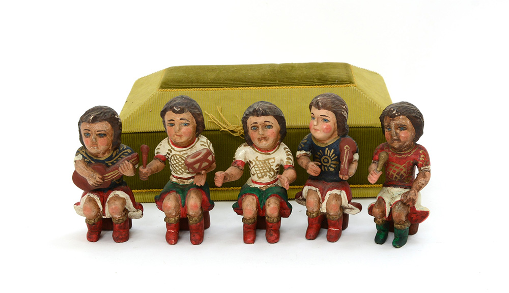 Lotto composto da cinque bambini portafortuna brasiliani in legno con scatola difetti
