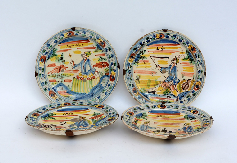 Lotto di quattro antichi piatti in ceramica policroma decorati con allegorie dei mesi di febbraio, luglio, settembre e ottobre (d cm 25) (difetti e restauri)