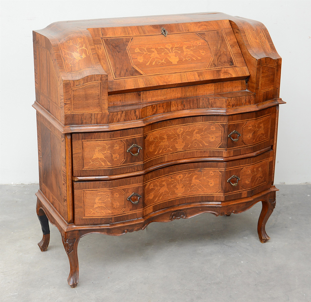 Piccola ribalta con fronte e gambe mosse, specchiature decorate da intarsi e filettature. Prima metà del secolo XX (cm 90x90x40) (difetti)