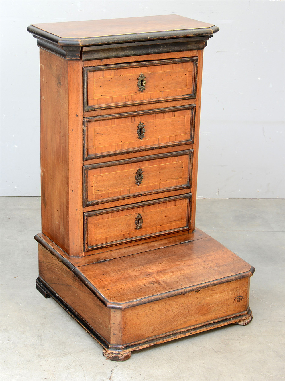Inginocchiatoio in noce a quattro cassetti con profili ebanizzati, pianetto...