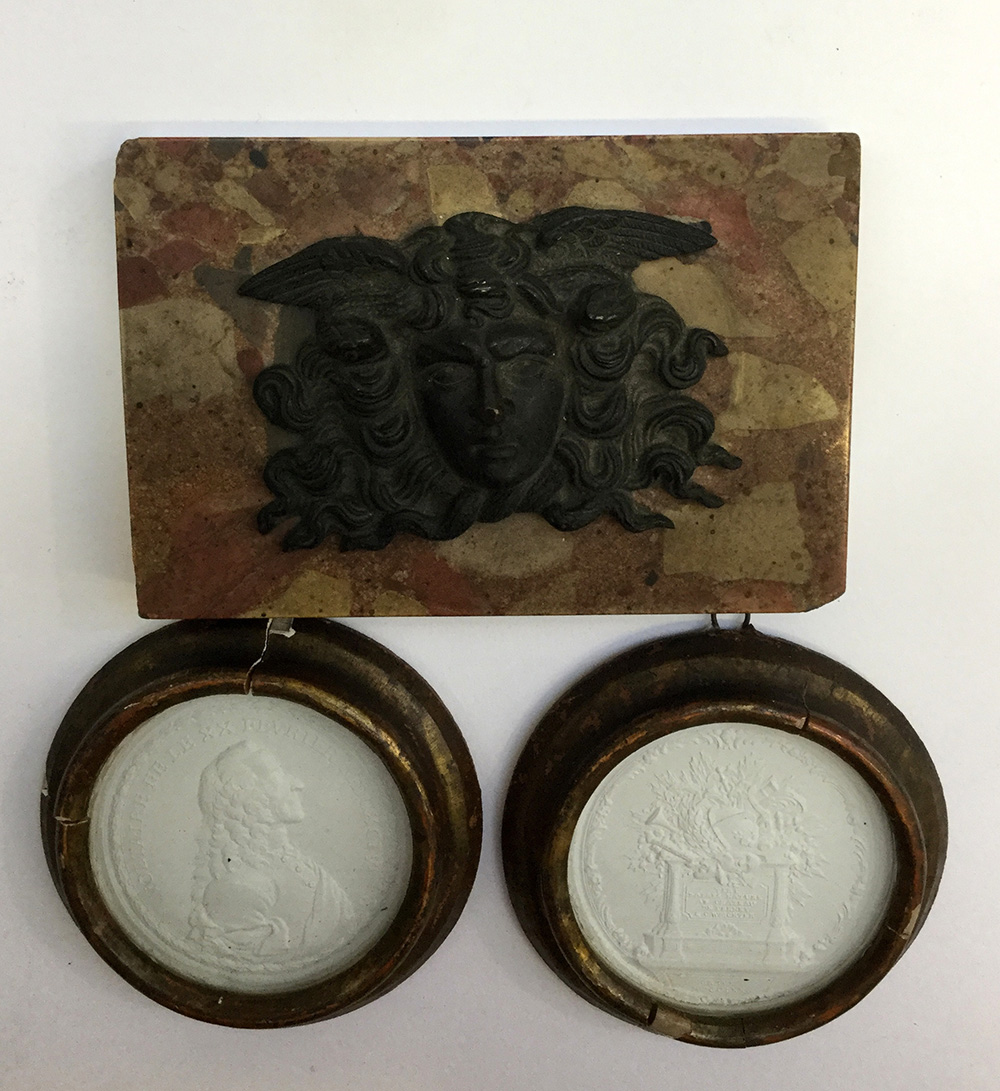 Lotto composto da due calchi in gesso decorati in rilievo ed una testa di Medusa in bronzo applicata su base in marmo, misure differenti (difetti)