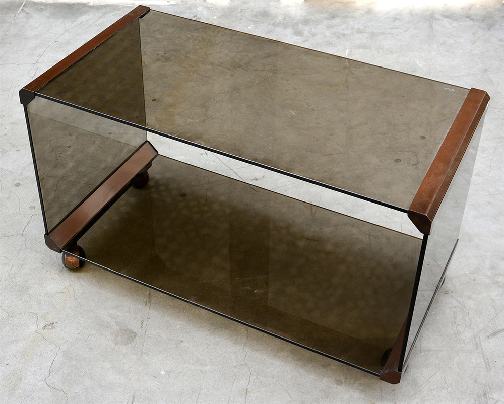 Tavolino da salotto munito di rotelle. Italia, anni '70. Metallo verniciato color rame e vetro fumè. (cm 81x48x41) (lievi difetti)