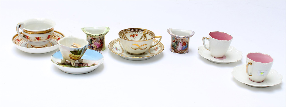 Lotto composto da sette tra tazzine e vasetti in porcellana di diversa fattura e decoro (difetti)
