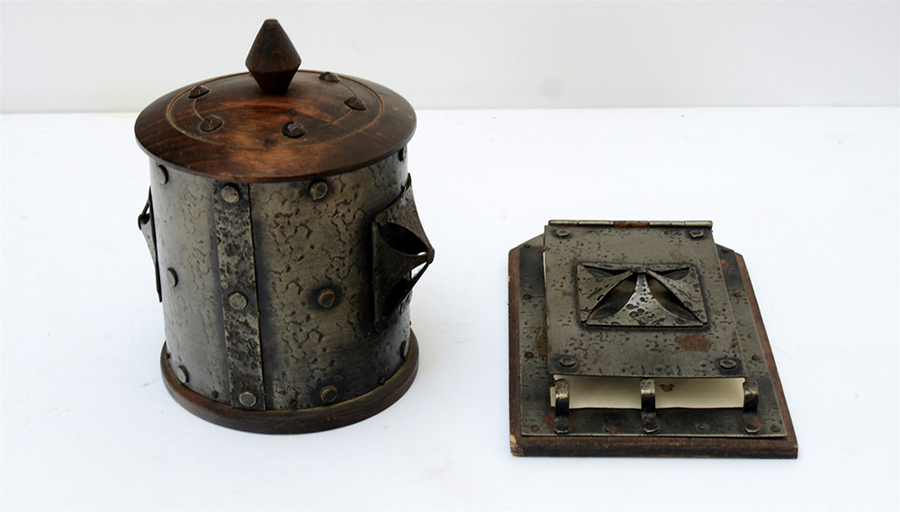 Lotto composto da un porta bloc-notes e una contenitore per tabacco, entrambi in legno e metallo (difetti)