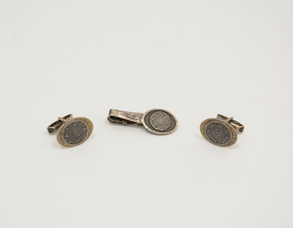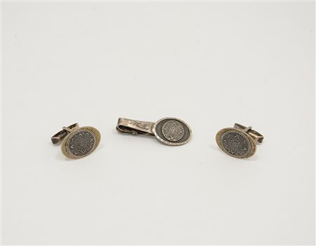 Lotto composto da una coppia di gemelli da polso e un fermacravatta in argento (lievi difetti)