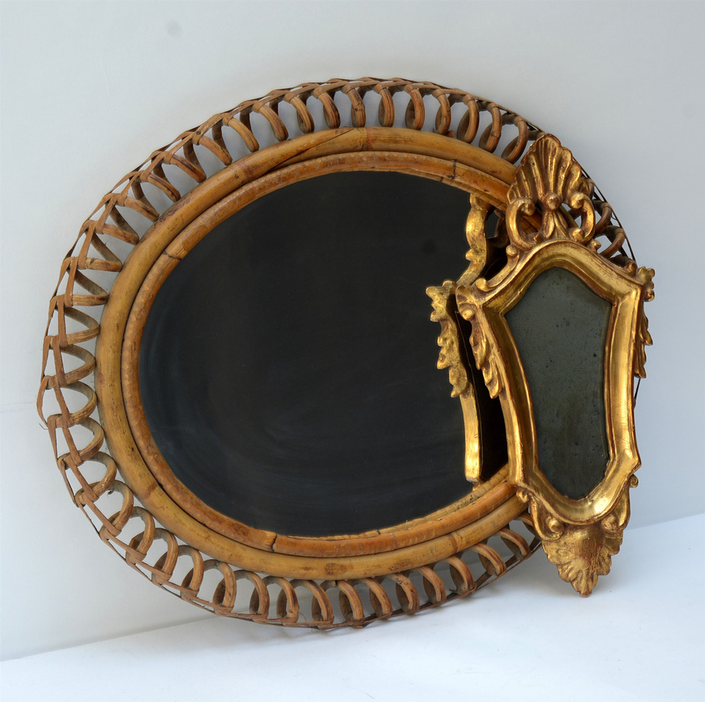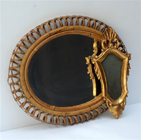 Lotto composto da un piccolo specchio ovale con cornice in midollo e una specchierina con cornice in legno intagliato e dorato (difetti)