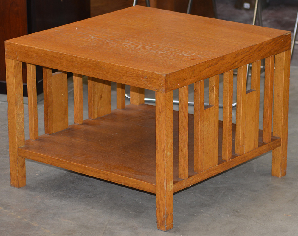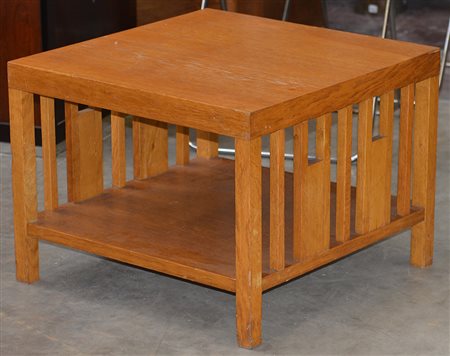 Tavolino da salotto impiallacciato in rovere di forma quadrata, a due ripiani con montanti traforato a motivi geometrici. Italia, anni '80. (cm 60x46x60) (difetti)