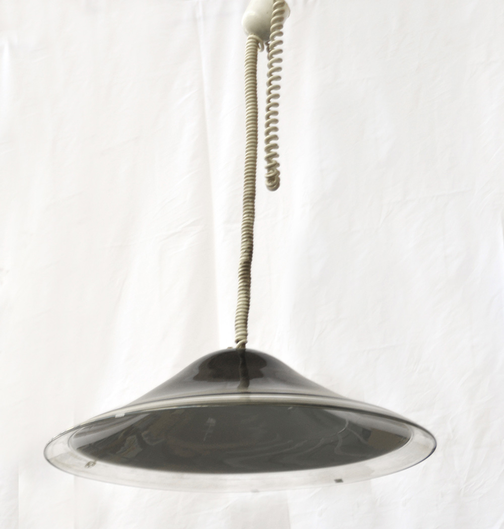 Lampada asospensione in vetro nero incamiciato bianco e trasparente. Produzione Leucos, Venezia, anni '70. (d cm 70) (difetti)