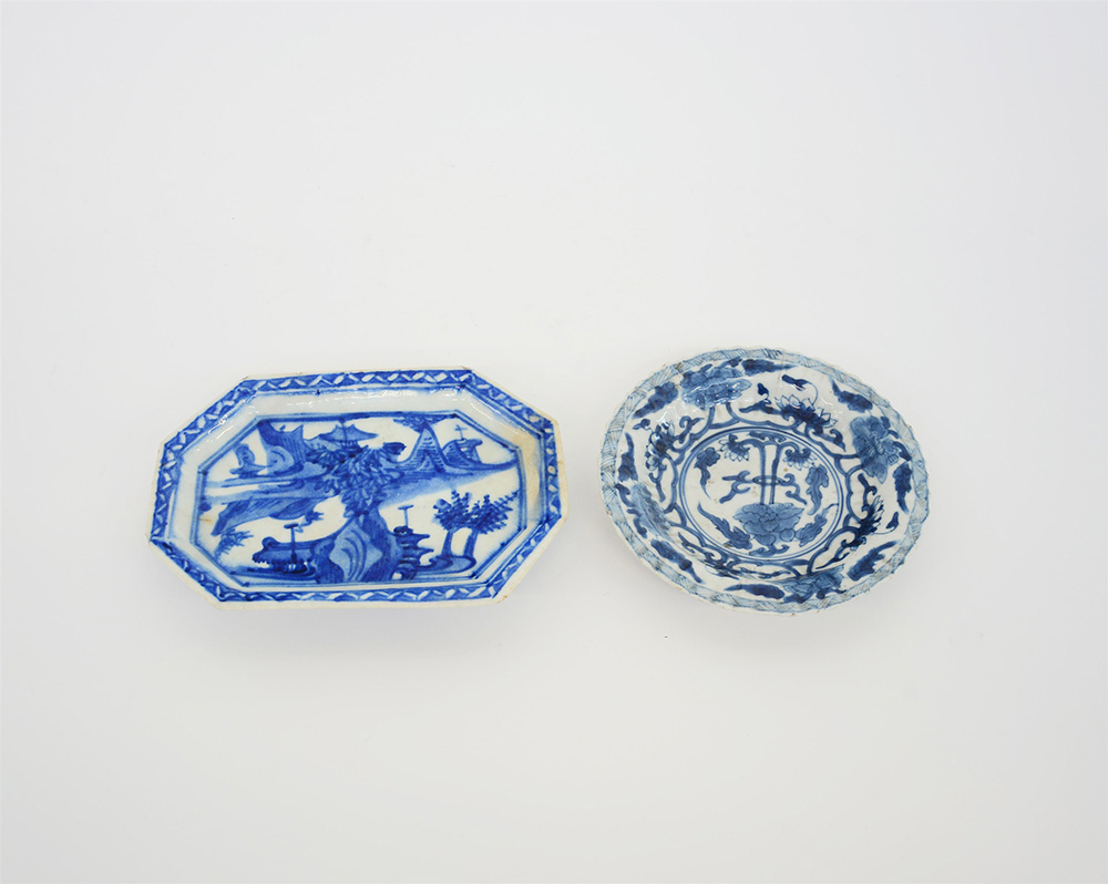 Due piattini in porcellana bianca e blu (difetti)Cina, secolo XIX (l.max 16,5 cm.)