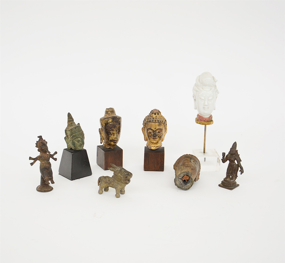 Quattro teste in bronzo ed una in Blanc-de-Chine e tre piccole sculturine in bronzo varie misure epoche e materiali