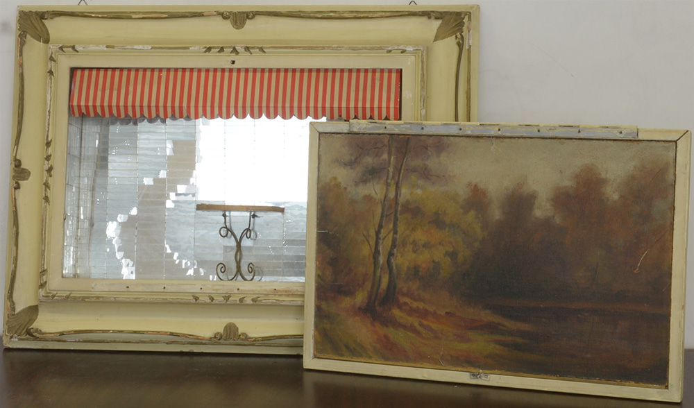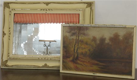 Mobiletto pensile con cornice laccata e sportello con scorcio boschivo dipinto su masonite, interni rivestiti da specchi a listelli, metà del secolo XX (cm 79x12x58) (difetti)