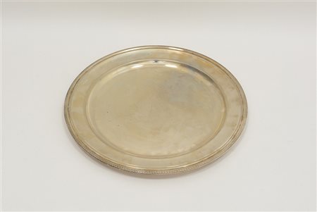 Sottopiatto in argento di forma circolare con bordura a palmette. Italia secolo XX (d cm 31,5) (g 540 ca.)