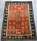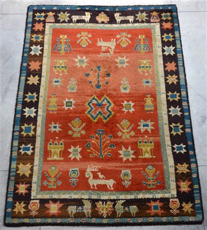 Disegno con simbologie stilizzate tipiche della Regione. Bordura a fondo marrone scuro decorata con stelle policrome. (cm 280x200) (difetti)