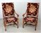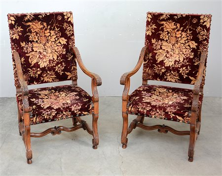 Coppia di seggioloni con braccioli mossi intagliati a motivi vegetali. Gambe e traverse scanalate. Rivestiti in tessuto a fiori (difetti)