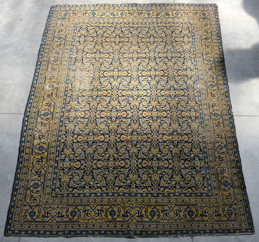 Disegno Herati nei toni del giallo, azzurro su fondo blu. (cm 333x240) (difetti)