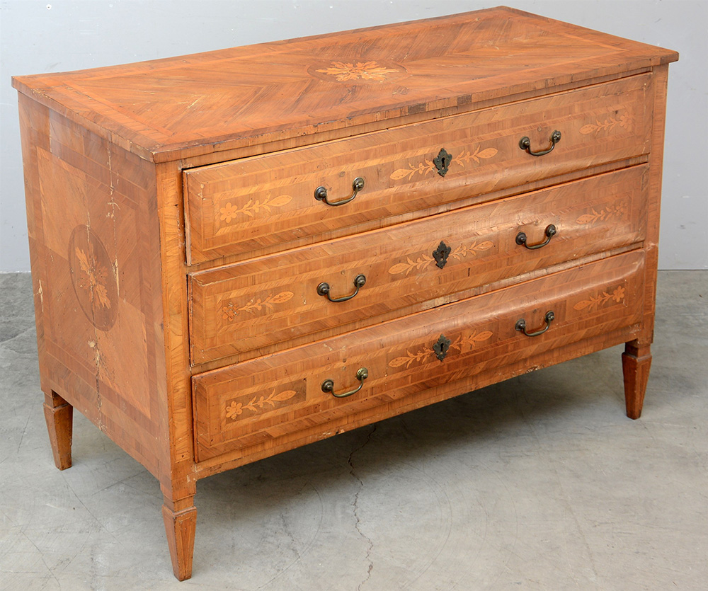 Cassettone a tre cassetti in legno lastronato in noce e intarsiato in legni vari a motivi vegetali. Gambe rastremate. Secolo XVIII (cm 123x83x56) (difetti e restauri)