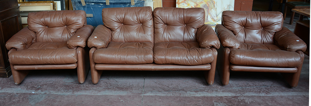 Fornitura da salotto composta da un divano e una coppia di poltrone in pelle modello "Coronado". Produzione B&B Italia, anni '70. (difetti)