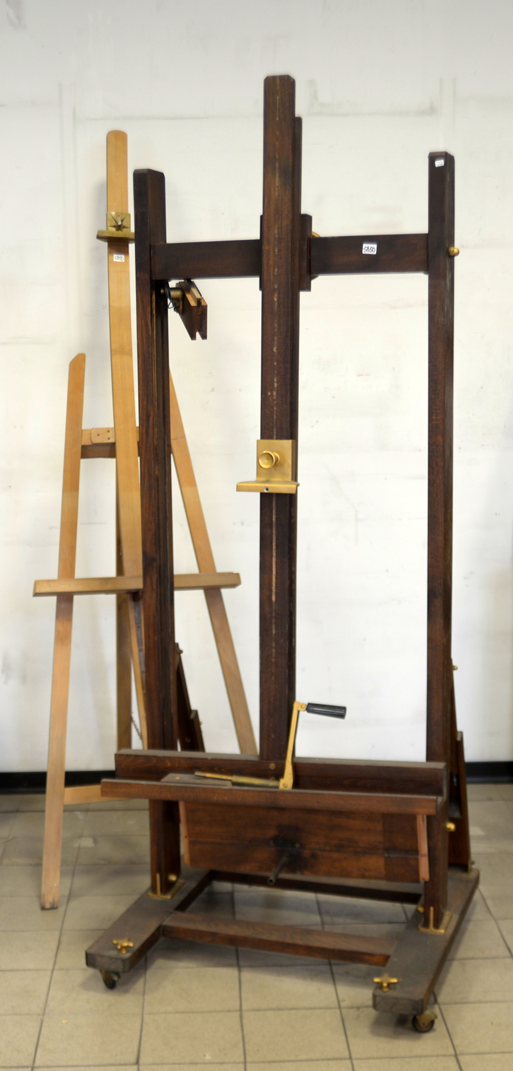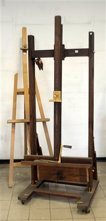 Lotto composto da due cavalletti in legno di cui uno a manovella regolabile in altezza (difetti)