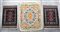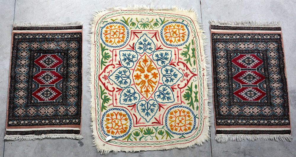 Lotto composto da tre tappeti orientali, di cui più grande in feltro ricamato.(max cm 128x96) (difetti)