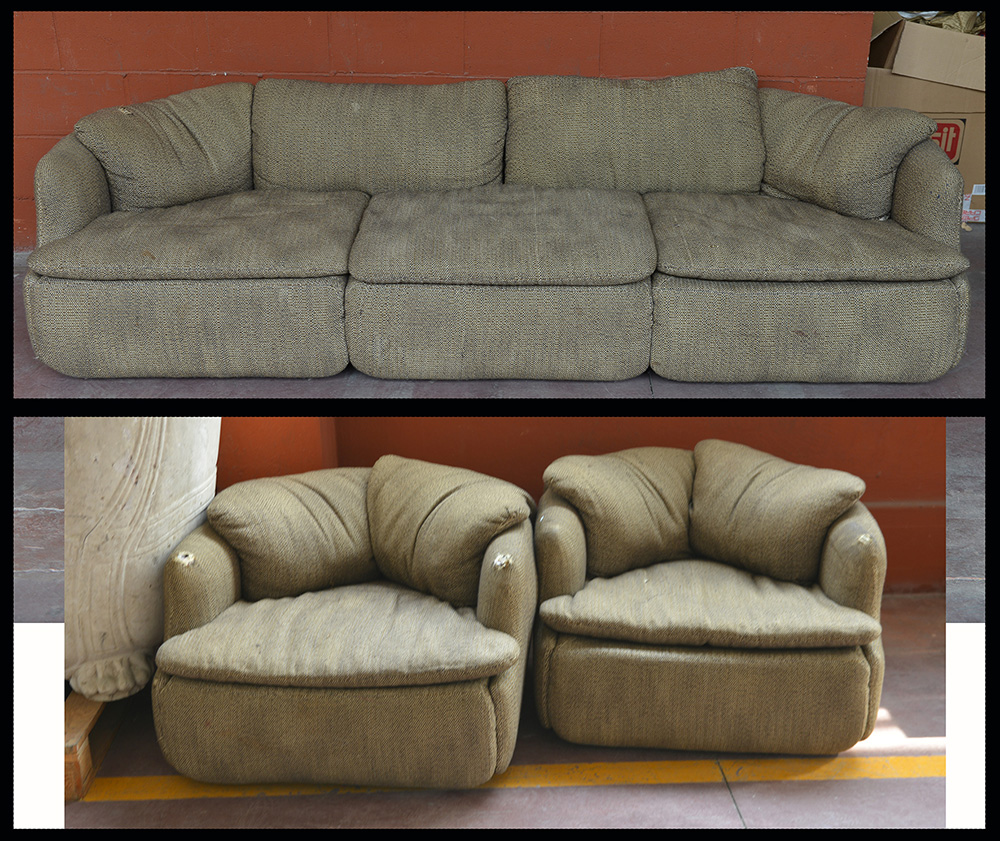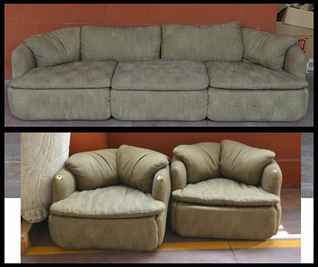 Fornitura da salotto composta da un divano a tre posti e due poltrone imbottite e rivestite in tessuto beige e struttura in metallo e plastica nera modello "Confidential". Produzione Saporiti, Besnate, 1972. (difetti)
