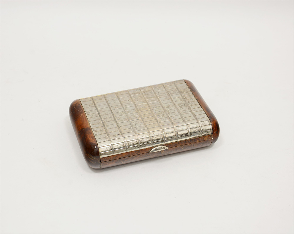 Portasigarette in legno con lastronatura in radica e inserto in argento...