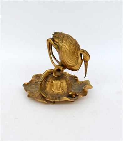 Calamaio in metallo dorato raffigurante un airone su una foglia. Inizio secolo XX (h cm 18)