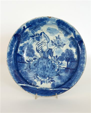 Manifattura di Delft (?), inizi del sec XVIII Piatto tondo in maiolica decorata in monocromia blu con figura femminile con cornucopia (l'estate)in un paesaggio con alberi (diam cm. 30.5)(sbeccature sul fondo)