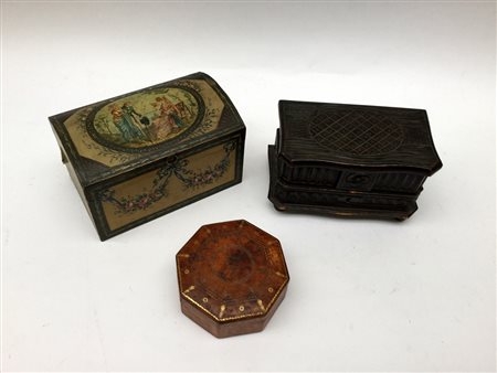 Lotto di tre scatoline in cuoio, legno e cartone. Fatture differenti (difetti)