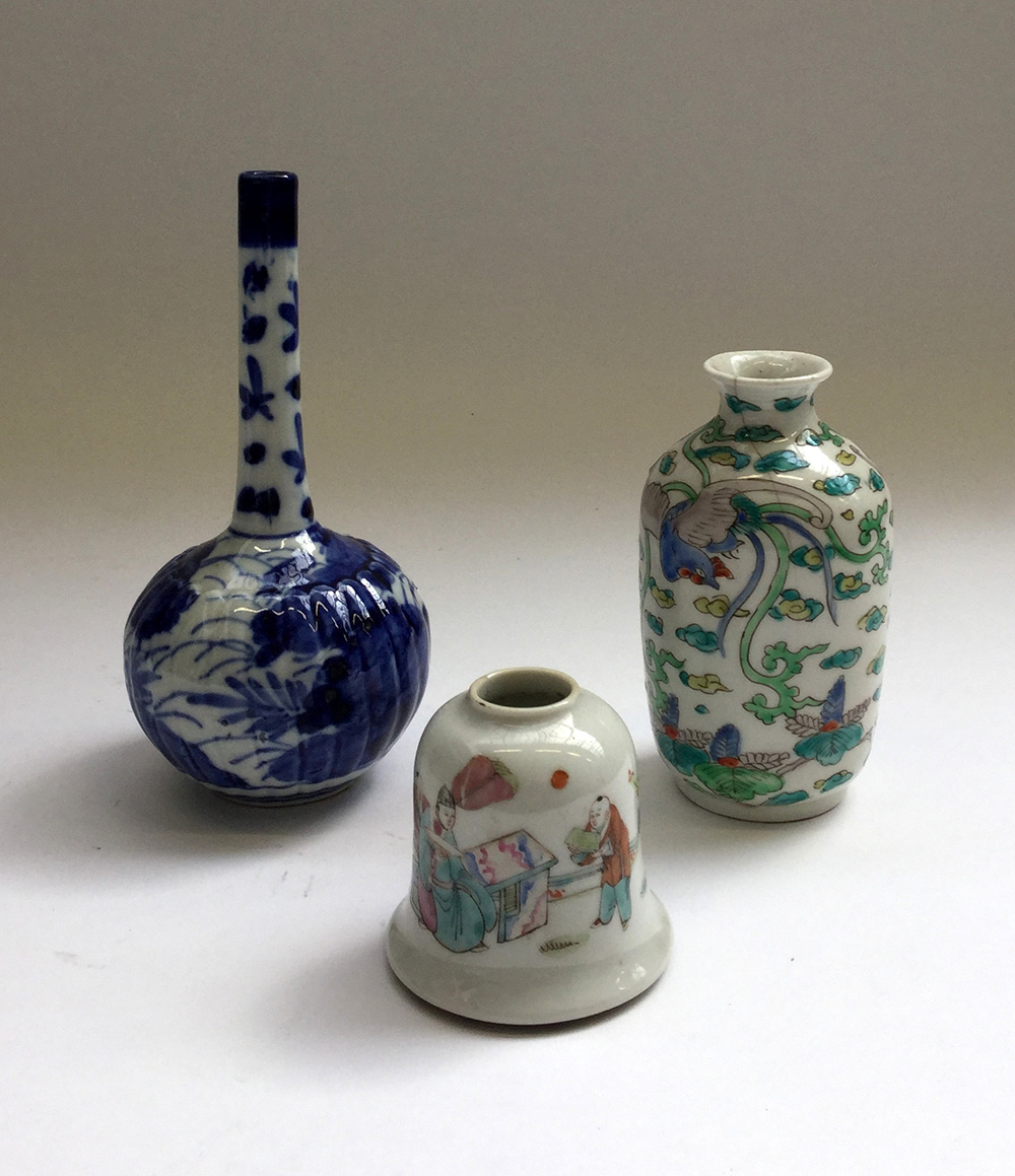 Tre vasetti in porcellana di forme, misure e decori differenti (difetti)Cina,...