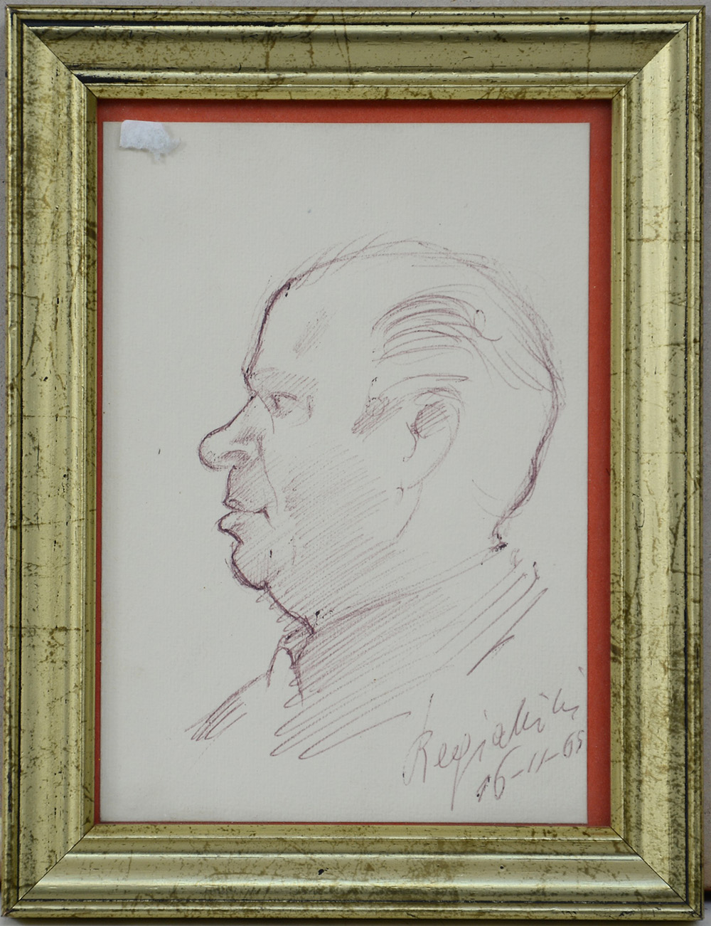 "Ritratto" 1965, disegno a penna su cartoncino (cm 16,5x11,5) firmato e datato in basso a destra, in cornice
