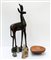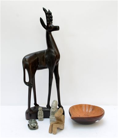 Lotto composto da quattro souvenir in pietra dura, un recipiente in legno forma di castagna ed una scultura in legno raffigurante una antilope (difetti)