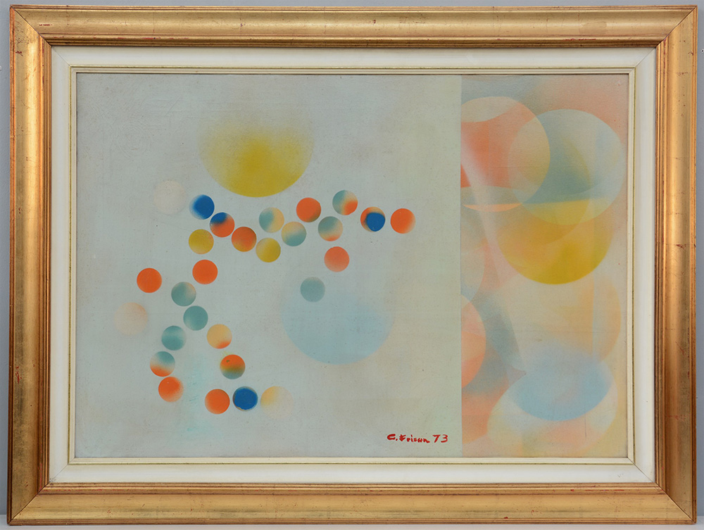 Ignoto "Composizione con sfere" olio su tela (cm 70x100) firmato "G. Frishr" e datato 1973, etichetta di garanzia al verso, in cornice