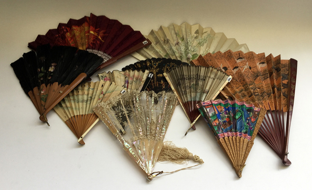 Lotto composto da dieci ventagli di epoche, materiali, decori e misure differenti, alcuni in custodia originale (difetti)