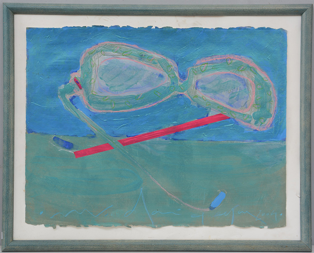 Firma indecifrata, "Occhiali" tecnica mista su cartoncino (cm 59x76 circa) firmato e datato 2004 in basso, in cornice (lievi difetti)