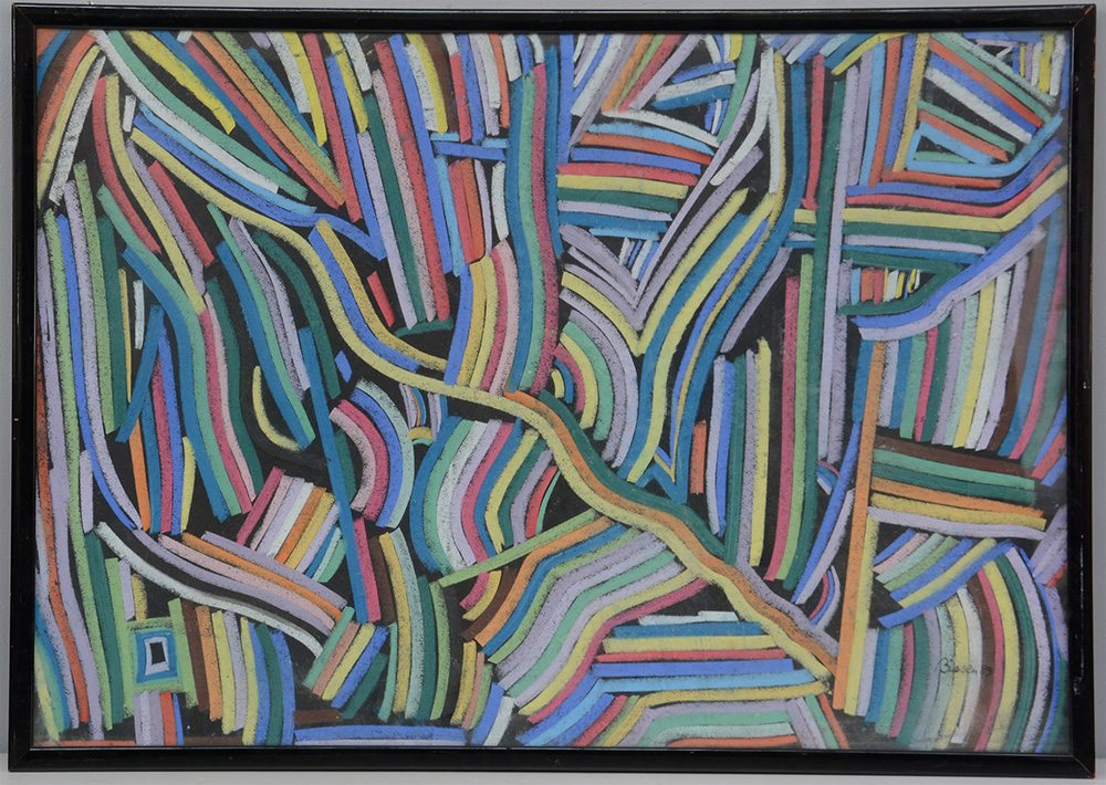Ignoto "Composizione" gessetti colorati su cartoncino nero (cm 70x100) firmato "Bissen" e datato 1989 in basso a destra, in cornice (difetti)