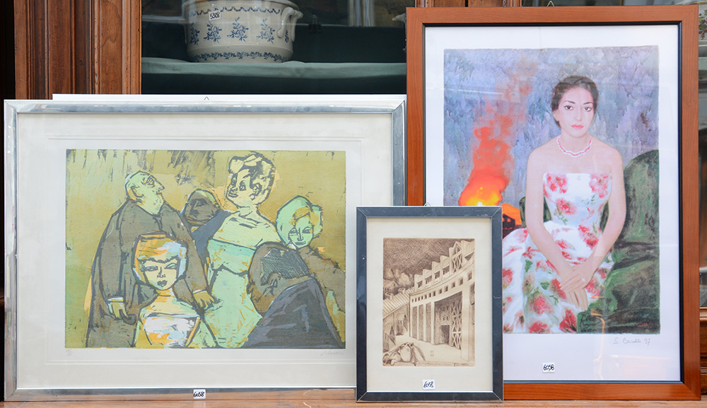 Lotto composto da una xilografia di Mino Maccari, una stampa offset di S. Caselli e un'acquaforte di Attilio Pizzigoni. Le prime due firmate e numerate in basso a matita; misure diverse, in cornici.