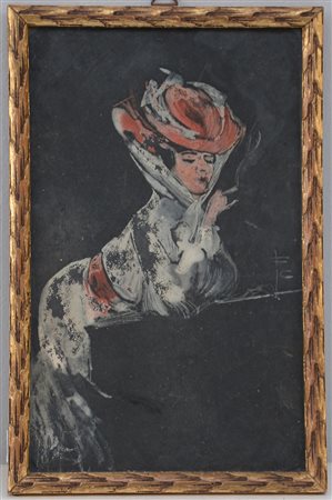 Bozzetto raffigurante un ritratto di donna con cappello e sigaretta, tecnica mista su carta (cm 22x13,5) in cornice. Vecchia attribuzione al pittore Fratino di Milano al retto, in cornice (difetti)